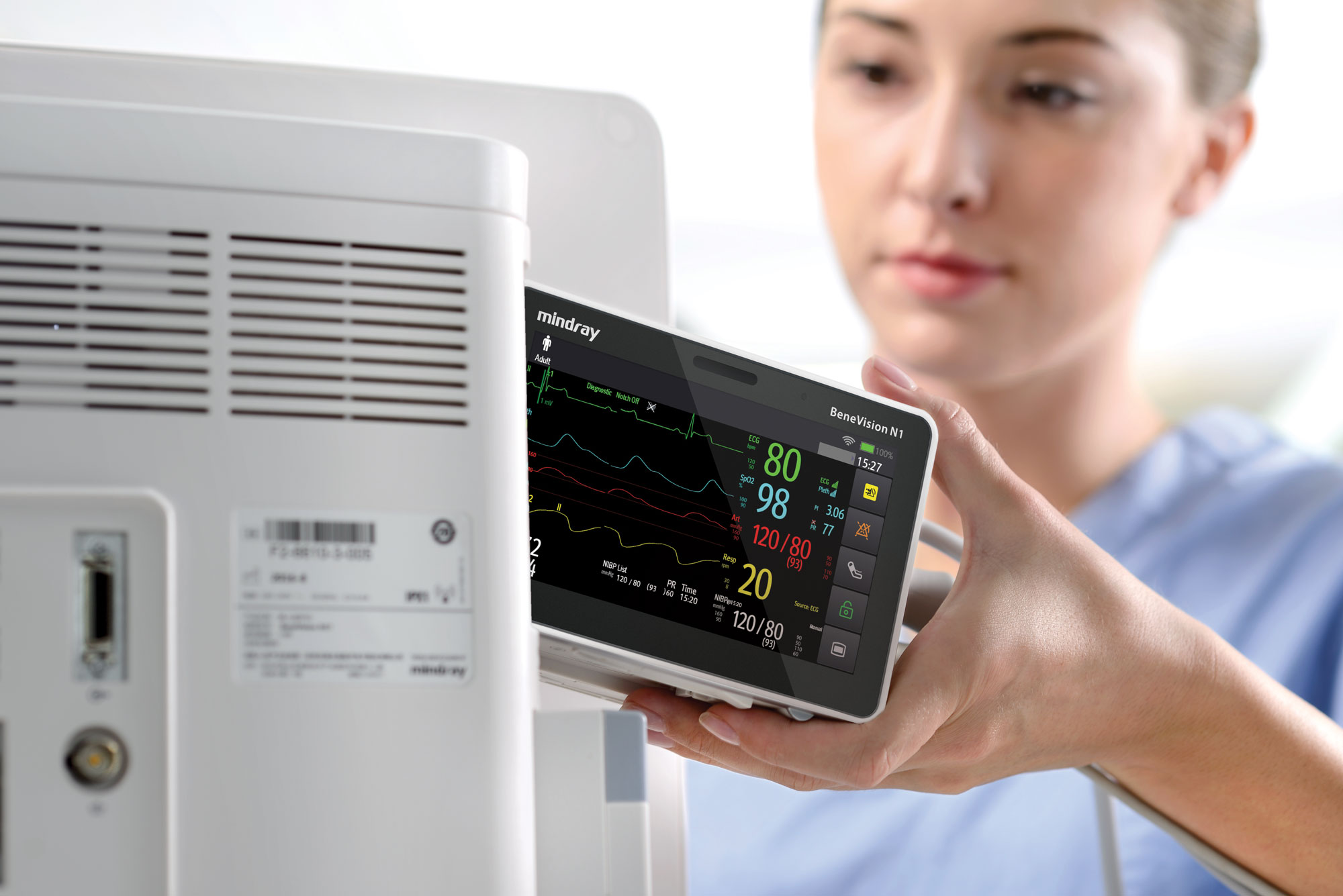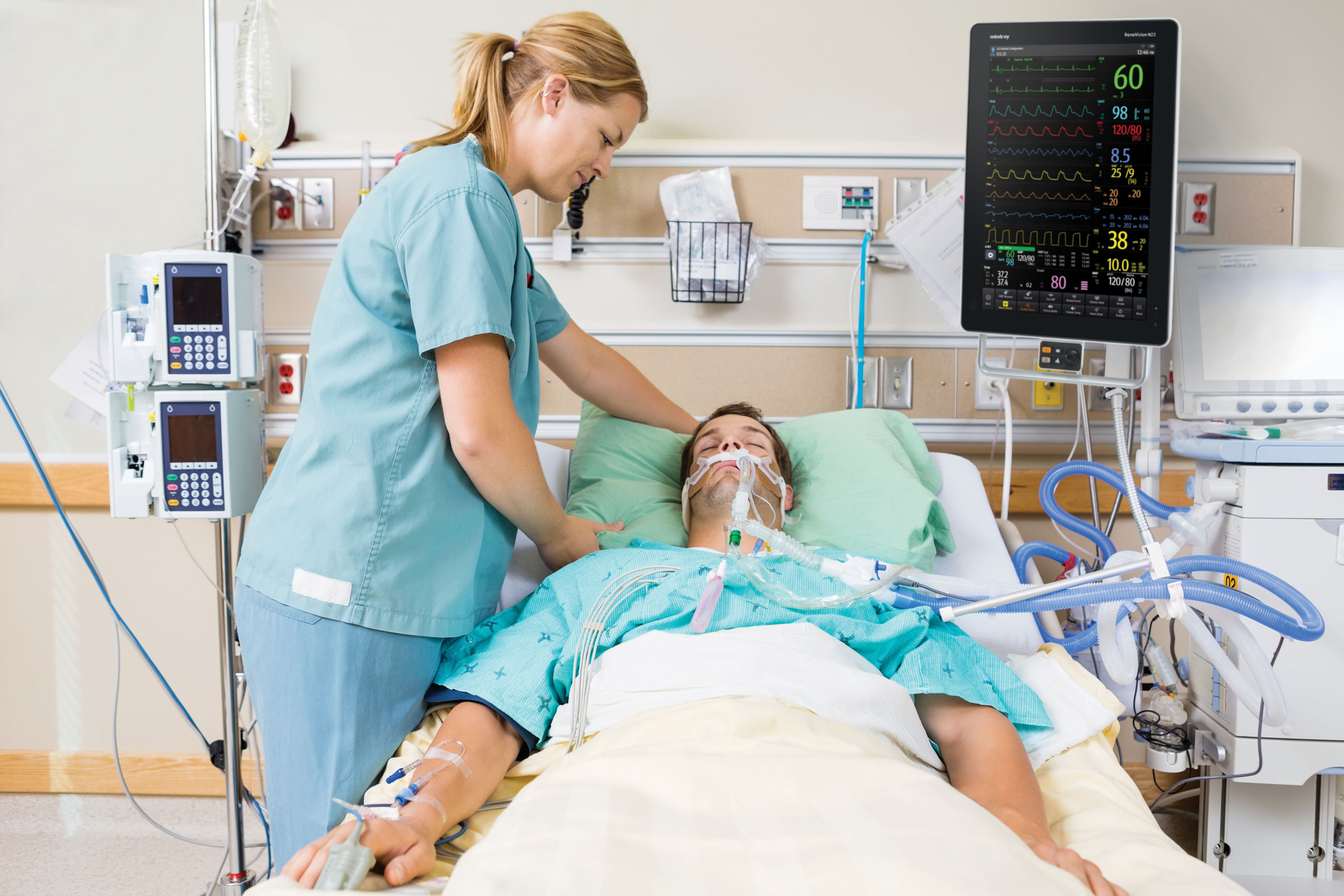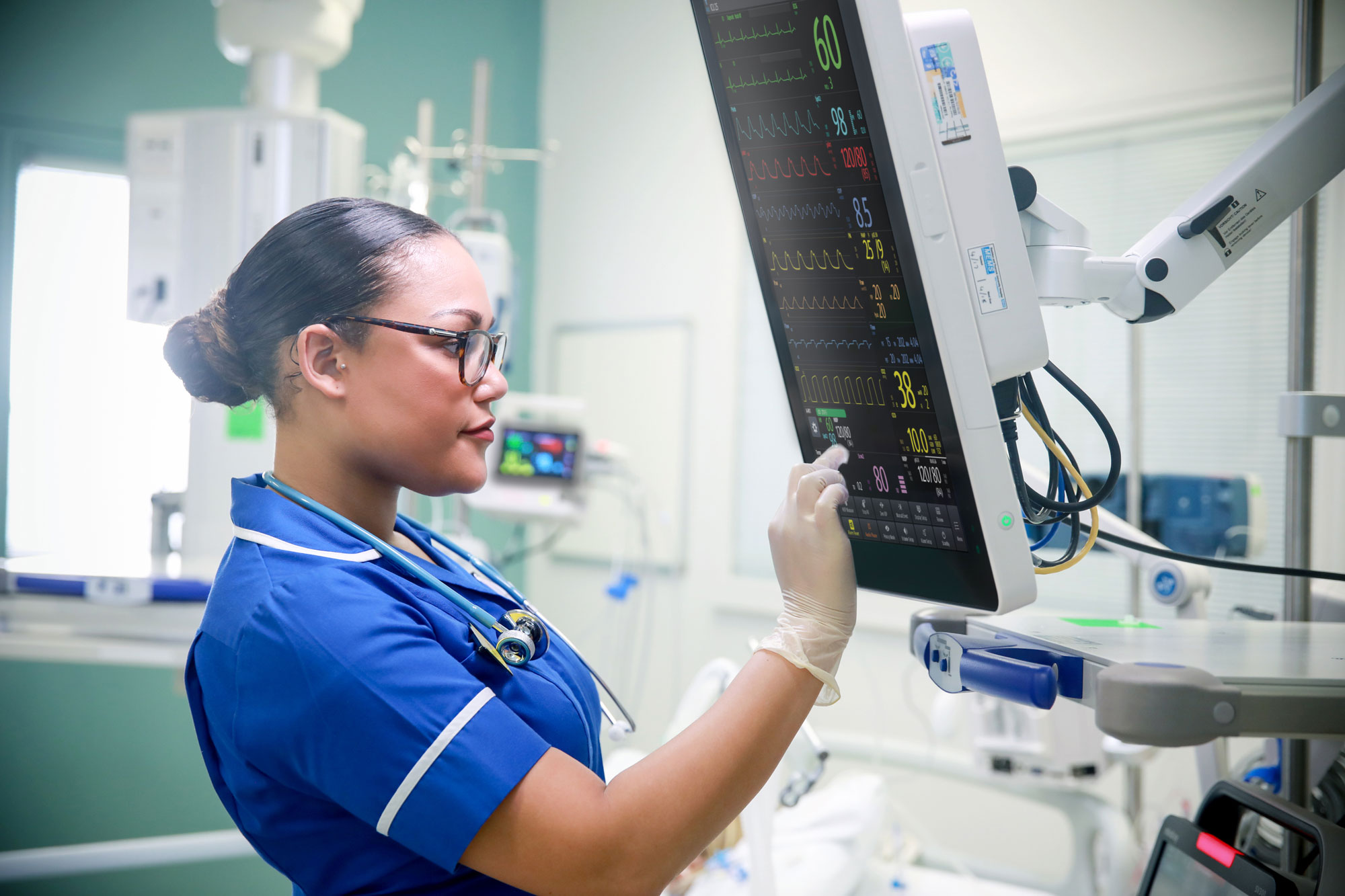 Patient rooms are crowded with multiple devices in use, limiting the clinician's ability to easily view and access bedside monitor